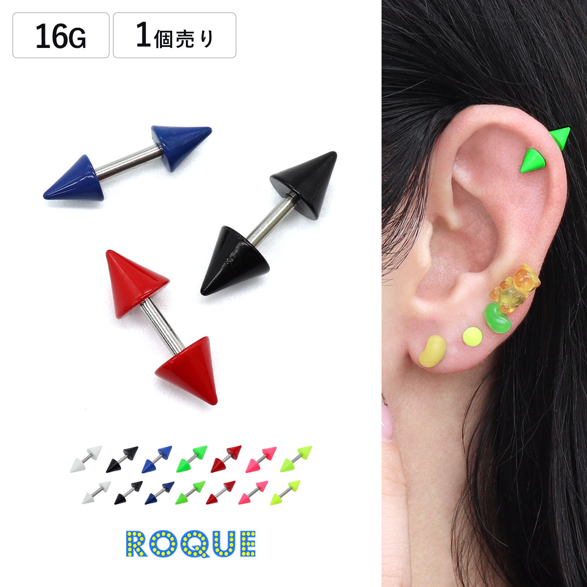 ボディピアス 16G カラフル スパイクコーン ストレートバーベル(1個売り)◆オマケ革命◆